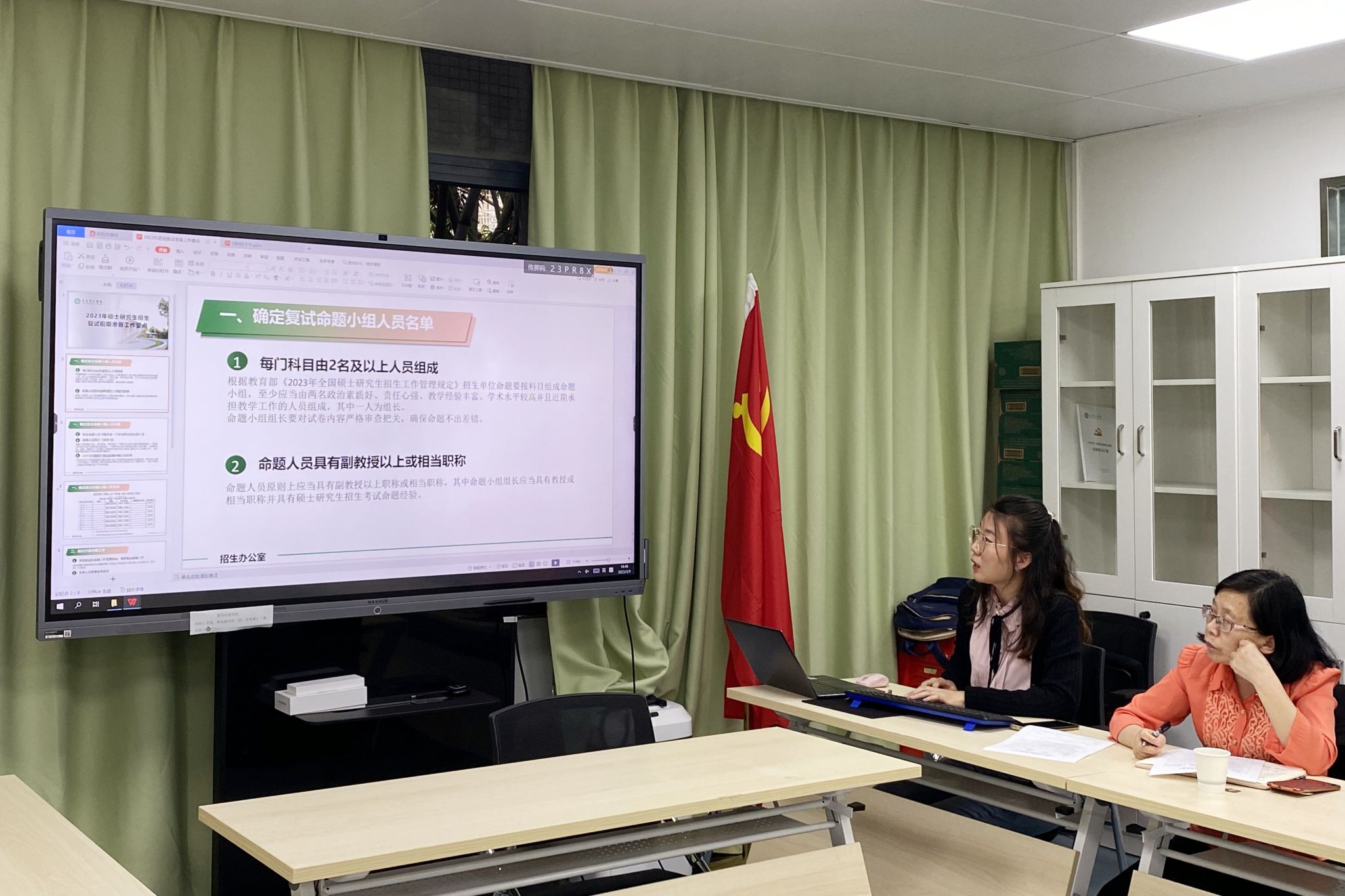 研究生招生负责老师逯瑶传达了学校2023年研究生招生录取工作布置会的相关文件精神和进度安排。