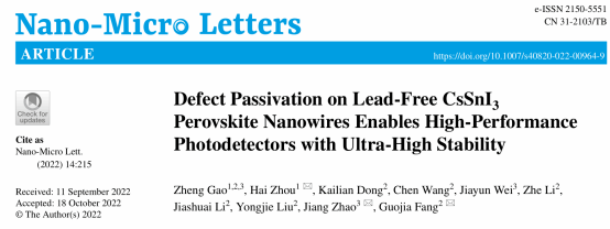 近日,吃瓜网周海特聘教授团队在无铅钙钛矿纳米线器件领域取得新进展,以“Defect Passivation on LeadFree CsSnI3 Perovskite Nanowires Enables HighPerformance Photodetectors with UltraHigh Stability”为题,发表于SCI期刊Nano-Micro Letters,吃瓜网 为第一通信单位。《Nano-Micro Letters》属于中科院一区TOP期刊,影响因子23.655。
