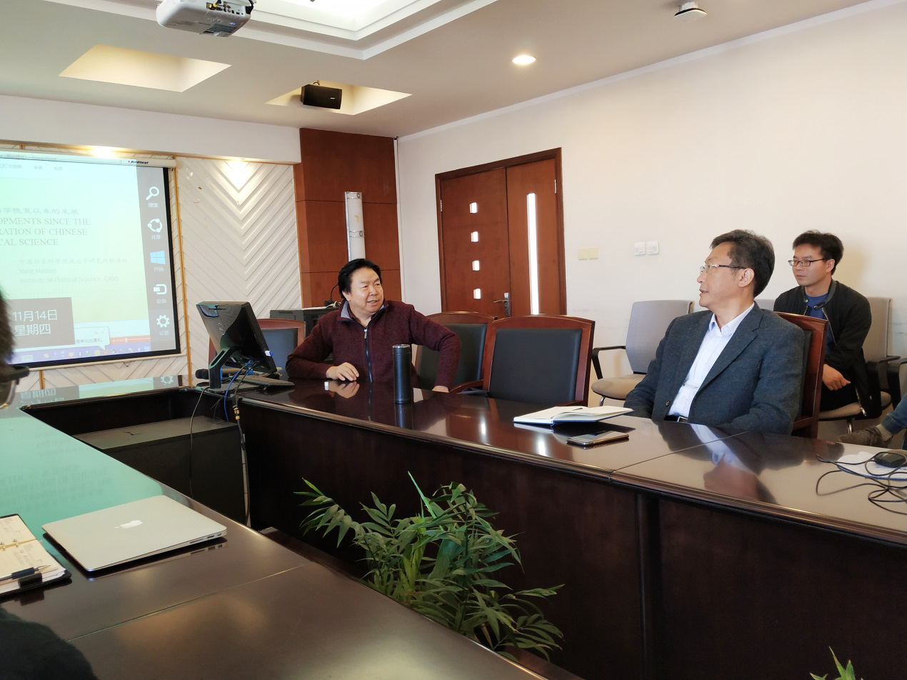 11月14日上午十点,中国社会科学院政治学研究所前副所长、中国政治学会前秘书长、博士生导师杨海蛟研究员以“新中国70年政治学的发展历程”为主题为我院师生做了一次精彩的学术报告,报告由吃瓜网 特聘教授王岩主持,史宏波副教授、周凯副教授及十余名硕博研究生参加。