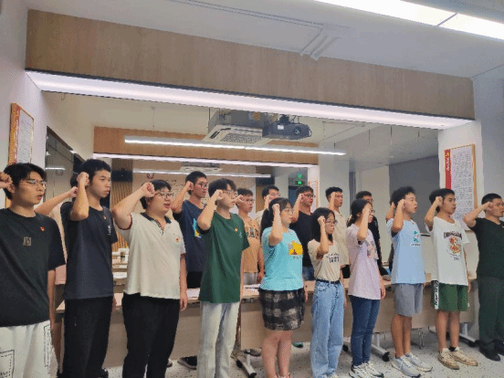 党委向2023年上半年入党的21位新党员表示衷心祝贺,并和学生老党员林智伟等为新党员佩戴党员徽章。随后,王凌卿老师领誓,老党员重温入党誓词,新党员们面对党旗郑重宣誓,洪亮的声音响彻现场。