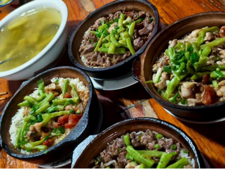 洪阳的煲仔饭讲究生米现煮,丝苗米搭配腊味、排骨、膏蟹等配料,慢火煲出金黄锅巴,焦香脆口,浇上调味汁滋滋作响,鲜香味浓,是地道美味。