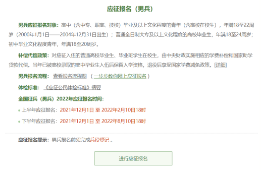 男兵应征报名对象:高中(含中专、职高、技校)毕业及以上文化程度的青年(含高校在校生),年满18至22周岁(2000年1月1日——2004年12月31日出生);普通全日制大专及以上文化程度的高校毕业生,年满18至24周岁;初中毕业文化程度青年,年满18至20周岁。