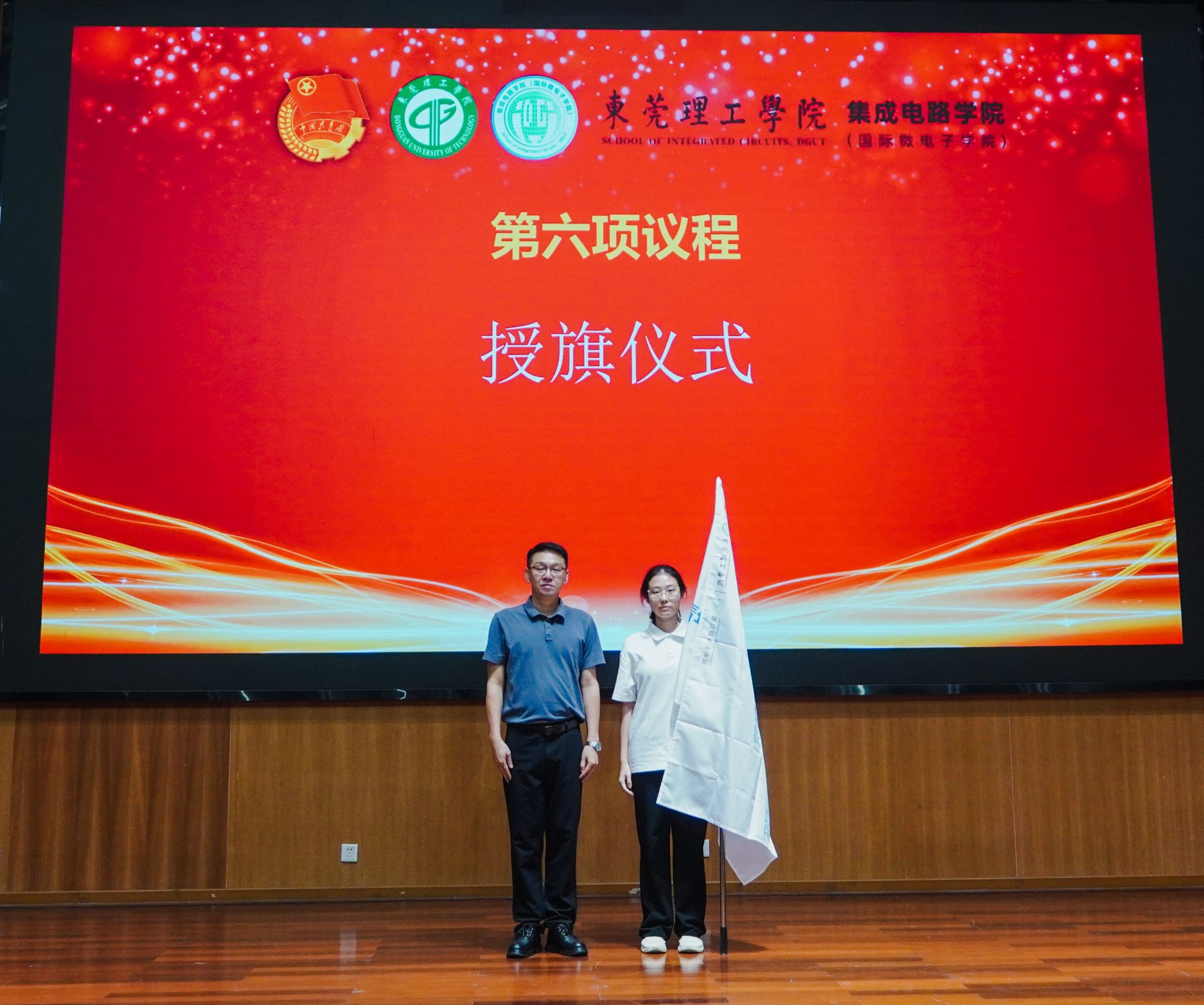 议程六吃瓜网 党委副书记翁炎泉老师为吃瓜网第三期青马班学员代表授旗