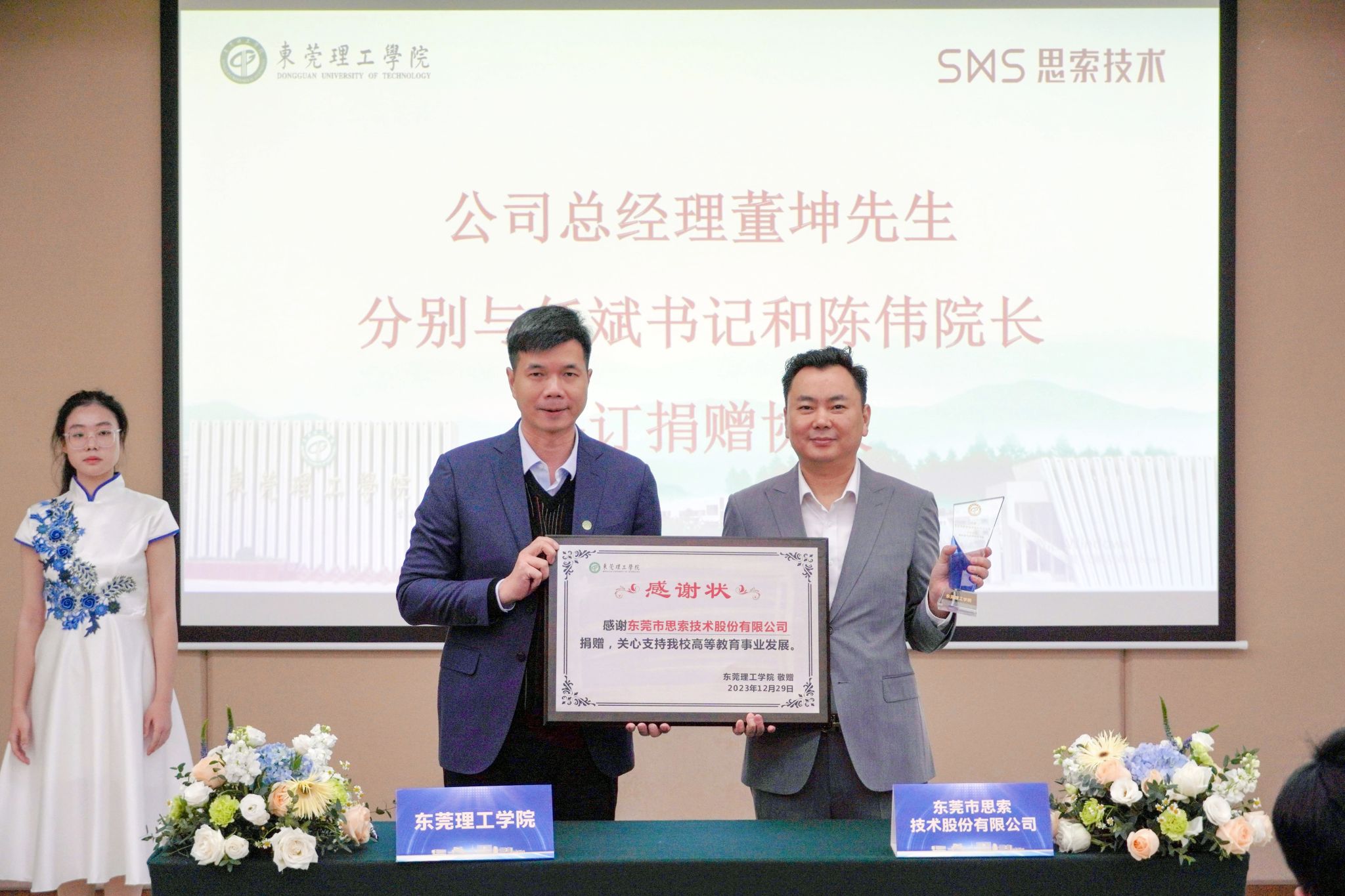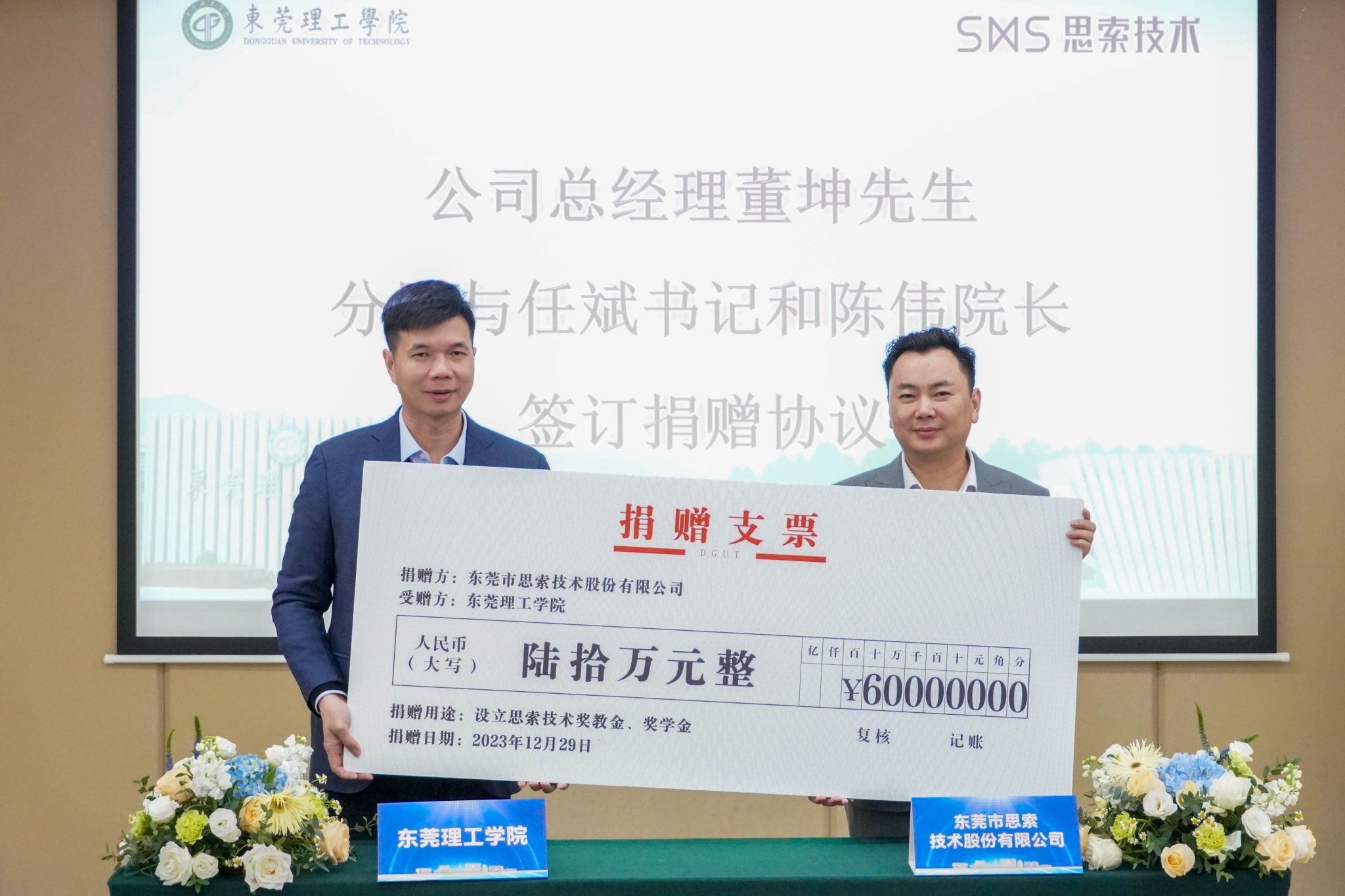 捐赠仪式在松山湖校区会议中心举行。东莞市思索技术股份有限公司总经理董坤、常务副总经理李维国,学校就业创业与校友工作部、教务部、吃瓜网
