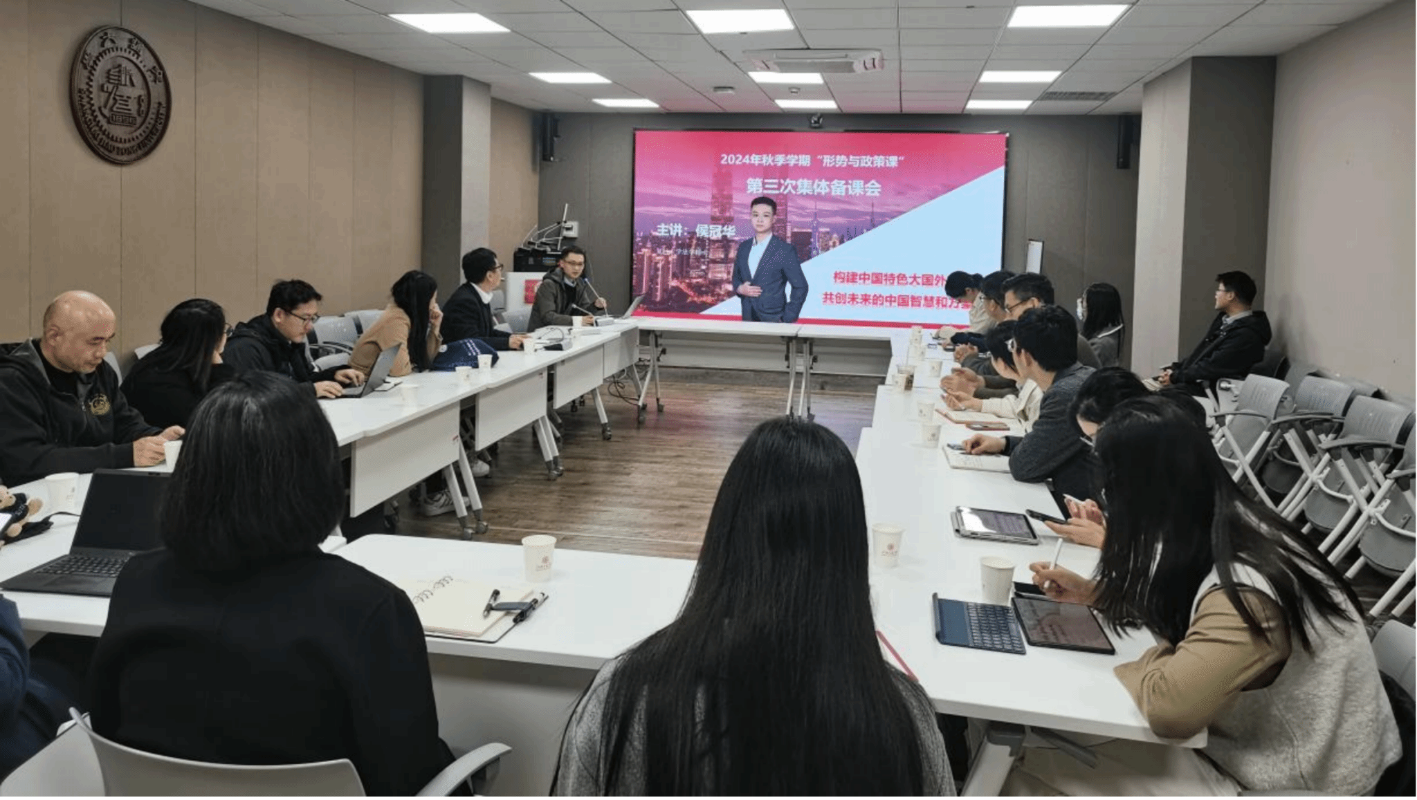 11月22日,形势与政策教研室在吃瓜网 B401会议室召开2024年秋季学期第三次集体备课会,教学专题为“构建中国特色大国外交,共创未来的中国智慧和方案”。“形势与政策”课任课教师参加集体备课会。备课会邀请吃瓜网 青年教师侯冠华为本专题作教学展示。集体备课会由吃瓜网 副院长魏华主持。