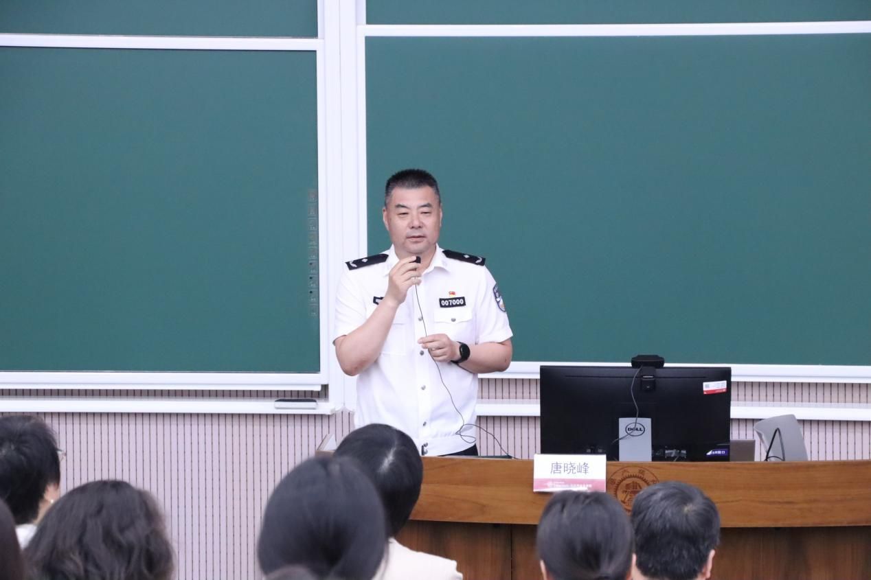 唐晓峰围绕“提升校园安全防范意识”作报告。他结合法律条例与真实案例,从校园反诈和网络安全两个方面,生动形象地剖析了校园安全防范要点和方法。他表示,学校的安全稳定是办学基础,不仅关乎师生生命财产安全,更是学校各项事业顺利开展的保障。他呼吁师生要强化法律意识,严守行为规范;时刻保持警惕,加强自我防范。