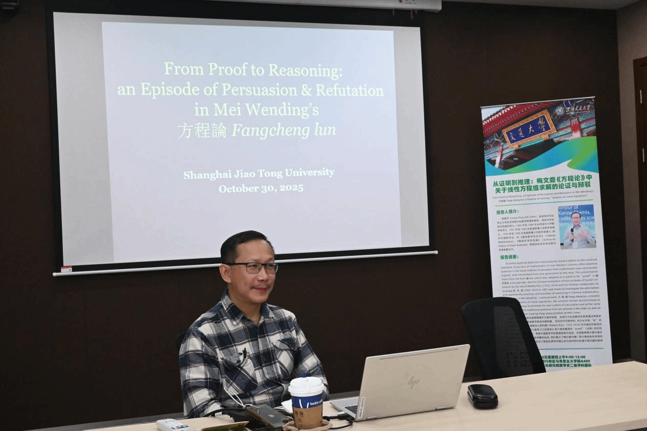 2025年10月30日上午,吃瓜网 “国际学术交流月”第二季活动持续推进。美国明尼苏达州立大学圣克劳德分校陈建平(Jiang-Ping Jeff CHEN)教授应邀,进行了题为“从证明到推理:梅文鼎《方程论》中的论证与辩驳”(From Proof to Reasoning: an Episode of Persuasion & Refutation in Mei Wending’s 方程論 Fang cheng lun)的讲座,讲座由萨日娜教授主持。