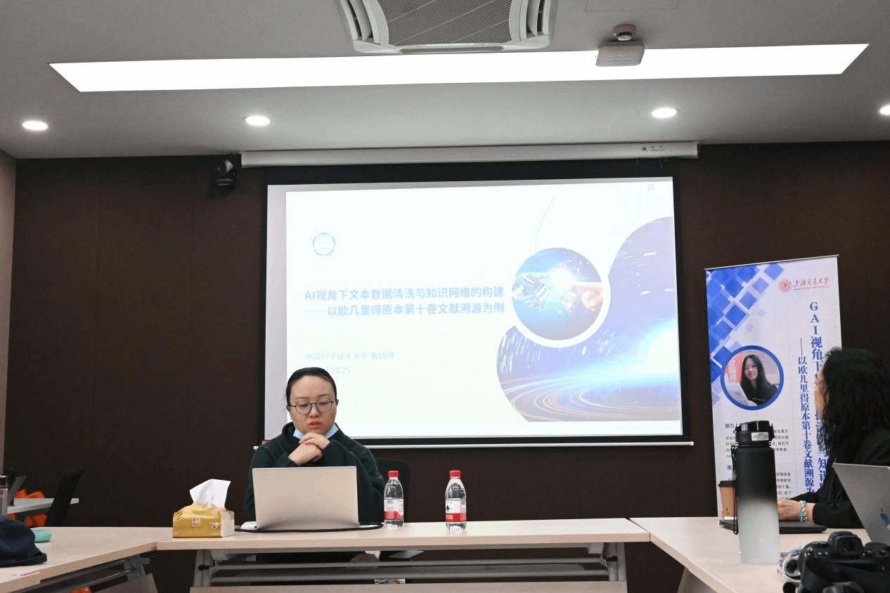 曹婧博副研究员以欧几里得《几何原本》第十卷为例,介绍了数字人文的前沿方法。她指出,研究通过系统性的数据清洗,构建了标准化的多语种语料库,进而运用知识图谱技术,可视化呈现不同版本间的引证关系与诠释脉络。在此基础上,引入生成式人工智能构建知识网络,准确识别关键传播节点,有效追溯概念的跨文化演化过程,为数字人文背景下的数学史研究开创了新的方法论范式。