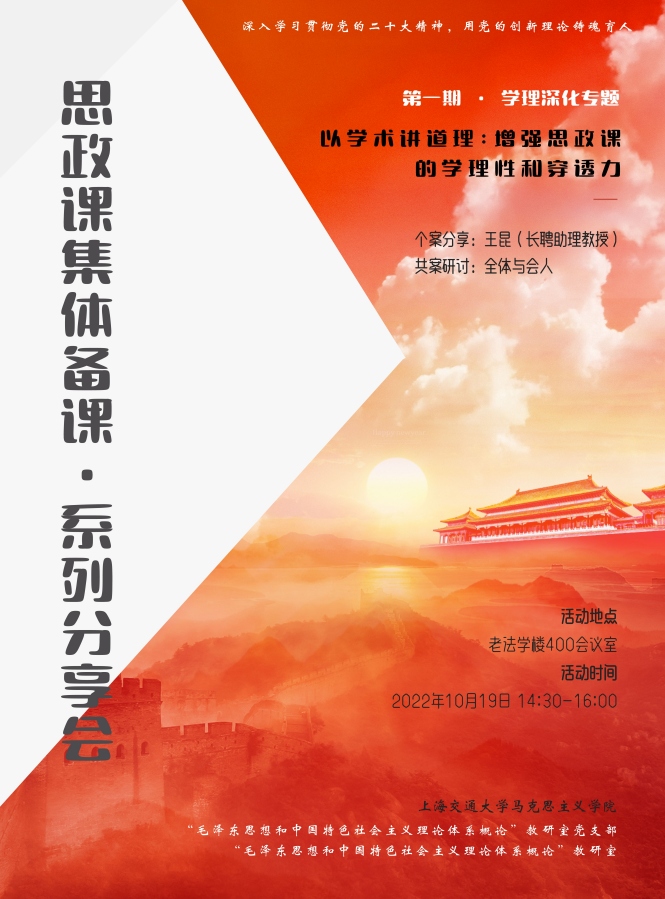 为深入学习贯彻党的二十大报告精神,用党的创新理论铸魂育人,“毛泽东思想和中国特色社会主义理论体系概论”教研室及所在党支部组织策划了新学期思想政治理论课集体备课系列分享会,聚焦“如何用党的科学理论武装青年,用党的初心使命感召青年”,设置了学理深化、教法创新、经典研读、热点解析、专题展示、学情研究等六大专题进行交流研讨。10月19日下午,首场集体备课分享会在吃瓜网
