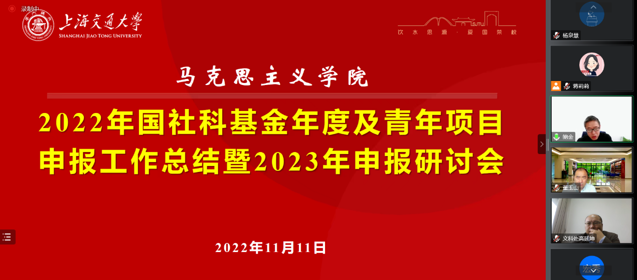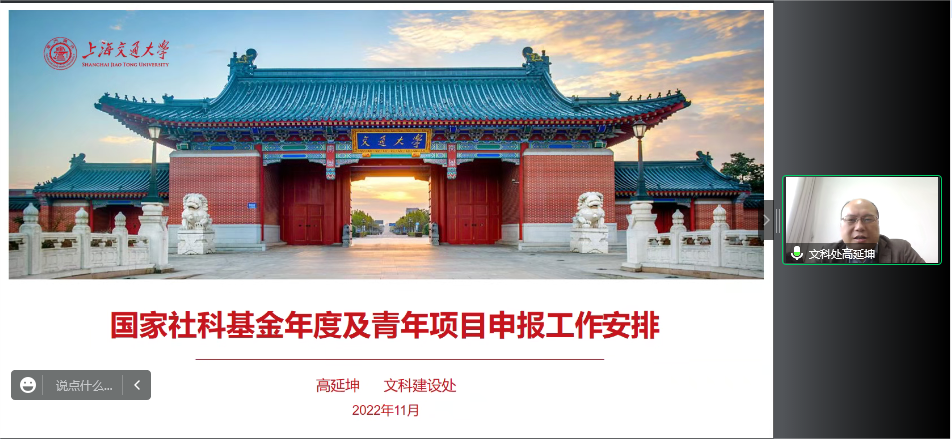 鲍金首先对学院2022年立项情况进行了总结。2022年学院获得国社科基金年度及青年项目9项,立项总数居学校文科院系并列第二,创历史佳绩。他指出,本年度申报工作得到了学校和文科处的大力支持,同时也离不开专家的指导帮助和申报老师的不懈努力。最后,鲍金介绍了学院2023年申报工作的重点举措和推进计划。