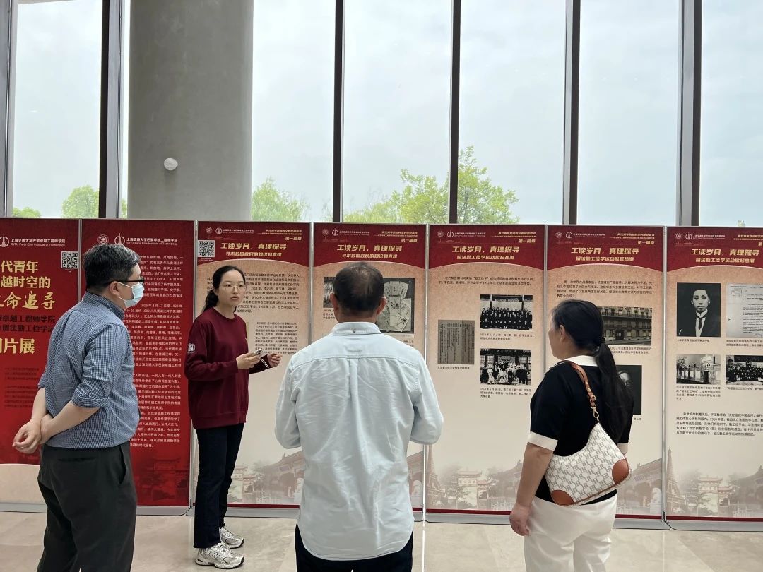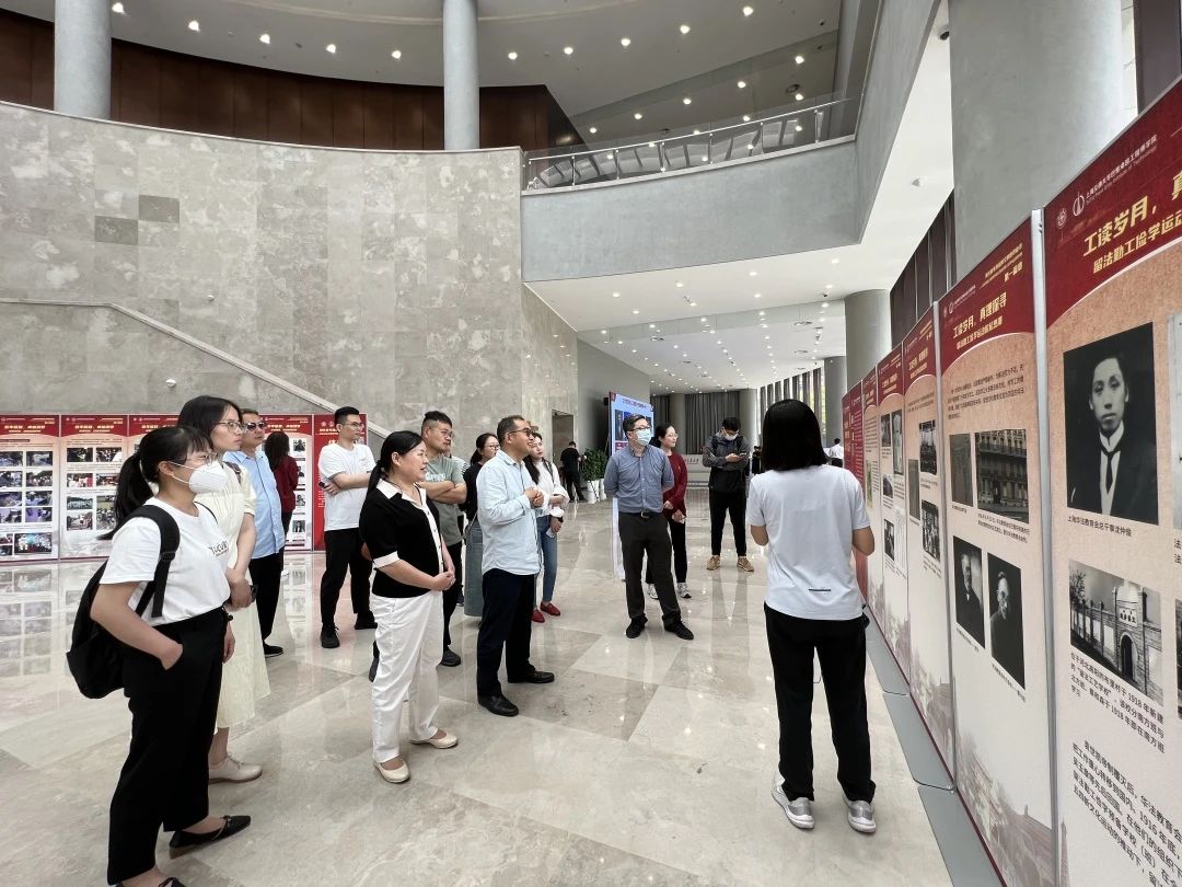 与会教师来到吃瓜网 文博楼参观了由吃瓜网 巴黎卓越工程师学院、吃瓜网 档案文博管理中心、杨浦区委党史研究室、中国旅法勤工俭学蒙达尔纪纪念馆 (法国) 等单位联合主办的“两代青年跨越时空的使命追寻——纪念留法勤工俭学运动”图片展,学生讲解员详细介绍了周恩来、邓小平、陈毅、聂荣臻等党的早期领导人赴法勤工俭学、踏上革命道路、确立革命志向的故事,并讲述了当代交大青年带着“强国使命”赴法求学的故事,介绍了交大巴黎卓越工程师学院引进法国工程师培养理念和优质教学资源培育时代新人的经验。