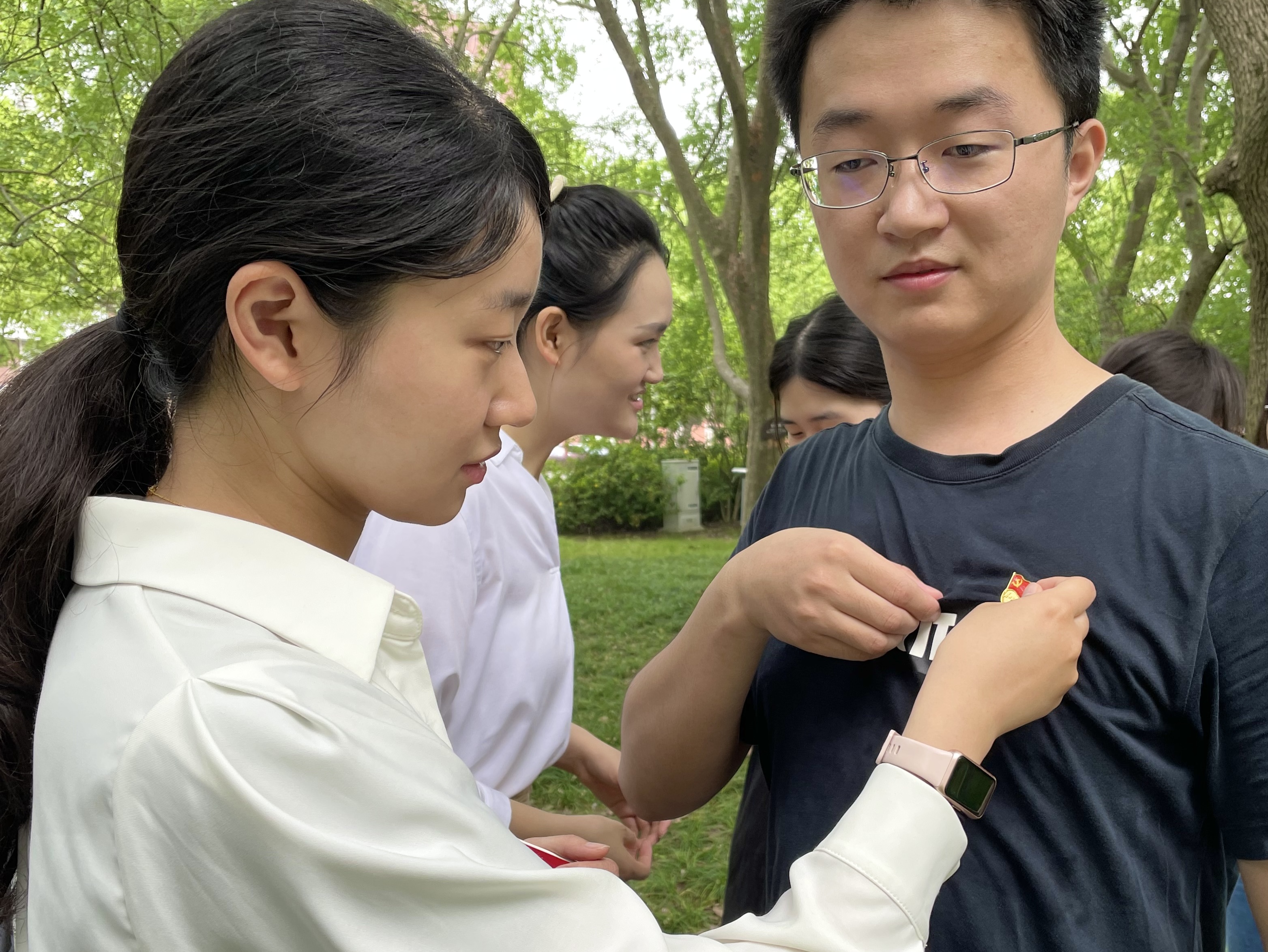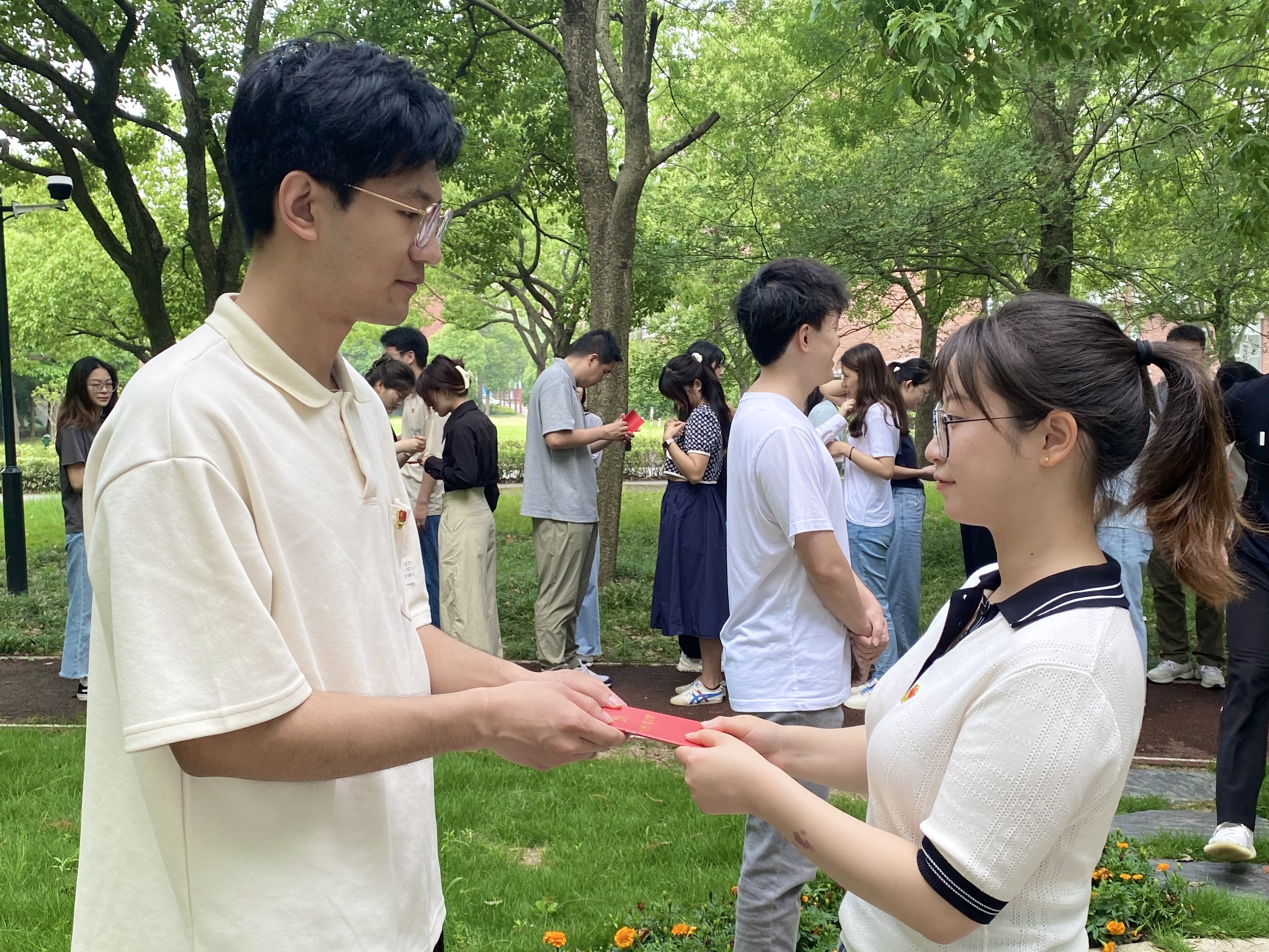 献花仪式结束后,入党介绍人为新发展入党的18名党员同志佩戴党徽、发放党章。科学技术史研究生党支部新发展党员蒋鹏宇表示,“能在英烈纪念雕塑前戴上党徽、接收党章,我感到无比荣幸。作为一名新发展党员,这也意味着我要以更严格的要求审视自己,用行动传承英烈们的革命精神,用奋斗书写青年党员的责任担当。”