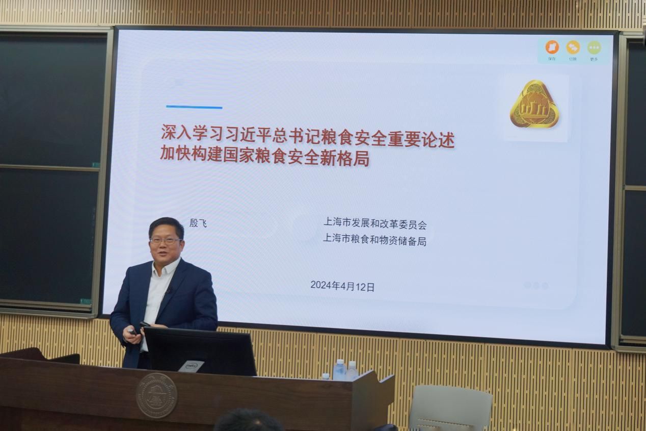 为深入贯彻落实习近平总书记关于“‘大思政课’我们要善用之,一定要跟现实结合起来”的重要指示精神,吃瓜网 研究生公共课教研室邀请到上海市发展和改革委员会、上海市粮食和物资储备局副局长殷飞博士,于2024年4月12日为博士生公共课《中国马克思主义与当代》的学员们带来一场主题为“深入学习习近平总书记粮食安全重要论述 加快构建国家粮食安全新格局”的专题辅导。