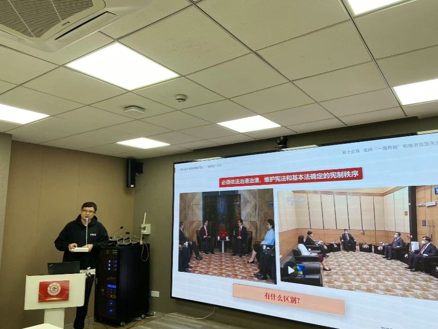 邓涛展示了第十五章《坚持“一国两制”和推进祖国完全统一》的教学设计, 重点讲述了“一国两制”在香港的实践以及台湾问题的历史渊源。在展示中,邓涛基于详细的历史资料、生动的现实案例,讲解了“如何全面准确理解和贯彻‘一国两制’方针”、“为什么说‘一国两制’是保持港澳长期繁荣稳定的最佳制度”、“为什么说祖国完全统一的时和势在我们这一边”等教学内容,清楚阐释了“一国两制”的价值意义。