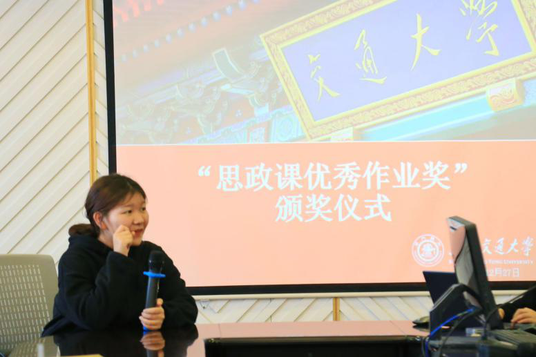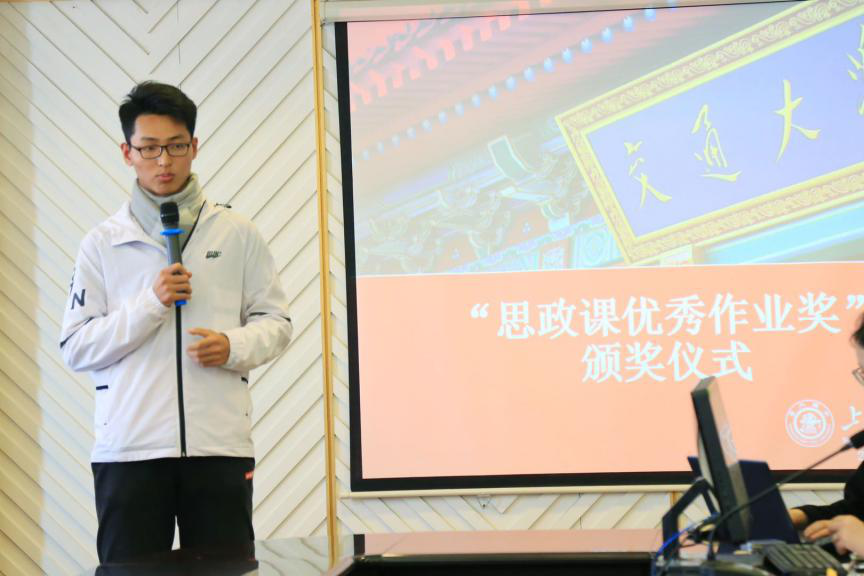 五位同学代表获奖学生发言,他们结合建国70周年国家的发展成就,分享了思政课作业创作的心得和体会。