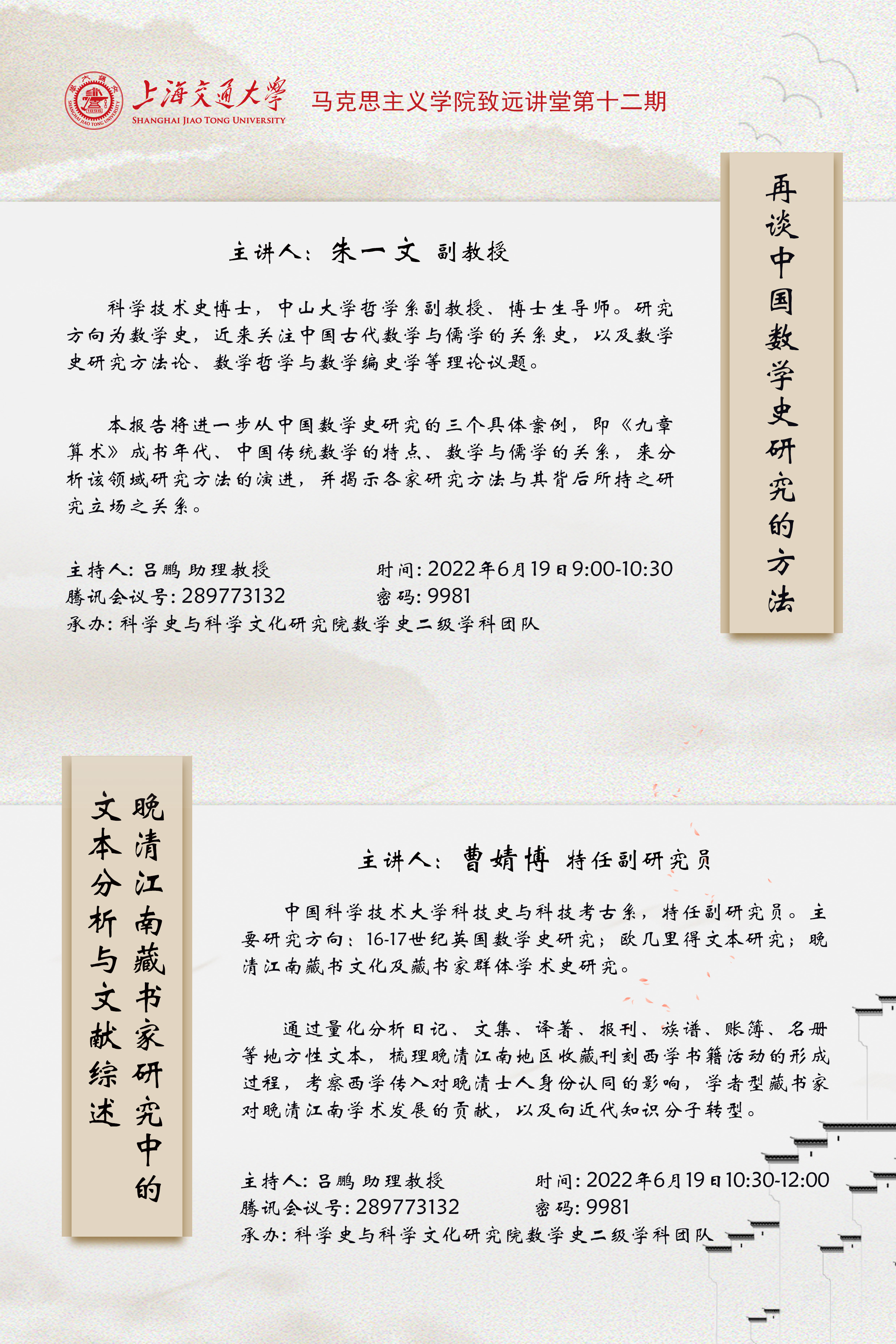 致远讲堂第十二期 | 再谈中国数学史研究的方法;晚清江南藏书家研究中的文本分析与文献综述