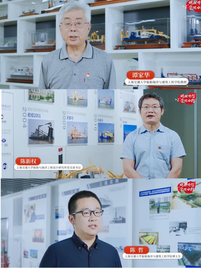 船舶海洋与建筑工程学院谭家华老师与陈新权老师作为教师党员代表,介绍了海上大型绞吸疏浚装备二十年国产化发展历程,以及在攻坚克难的过程中基层党组织发挥的重要作用。该装备国产化打破了设备国内无设计、无制造、无配套,核心技术被国外垄断的困境,为捍卫我国领土主权和海洋权益做出了重要贡献。陈哲同学作为学生党员代表,介绍了交大船舶人在师长言传身教和党员身体力行的鼓舞下,立志将学术追求和行业发展紧密结合在一起,用自己的知识和智慧助力祖国的海洋强国之梦。