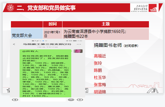 在庆祝中国共产党百年华诞当日,党支部号召党员老师为吃瓜网 对口扶贫的云南省洱源县中小学捐款、捐书:党员为第三党支部扶贫共建单位洱源县一中捐赠党史类著述近20多部;为洱源乡村小学捐助1650元,用于奖励每学期成绩优异者。