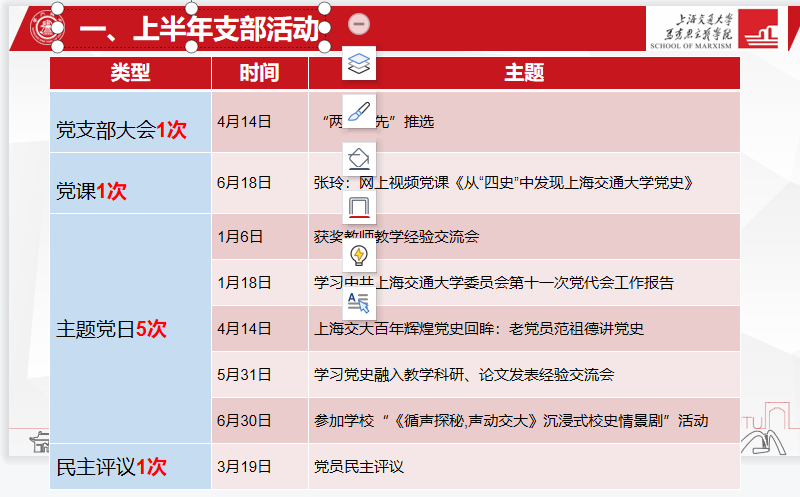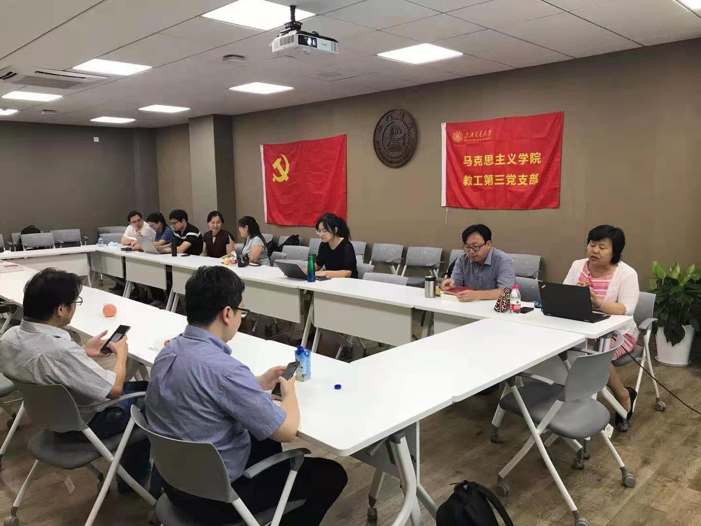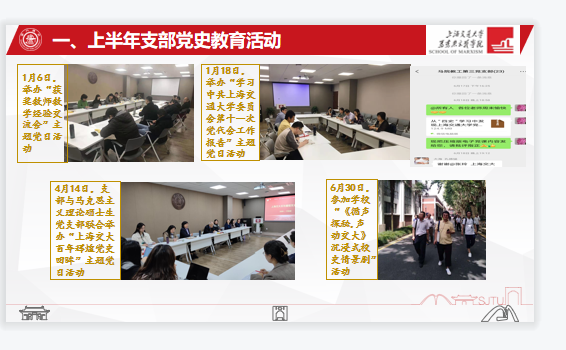 会上,支部商议研讨下半年党支部工作,组织把习近平总书记“七一”讲话精神入思政课堂、入科研等活动;排练话剧,庆贺党的百年华诞;参观上海历史博物馆;请党支部副书记和研究生党员讲党课等活动。