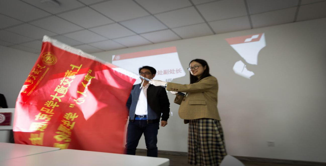 学生处副处长龚强向宣讲团负责人舒雅婷授旗。
