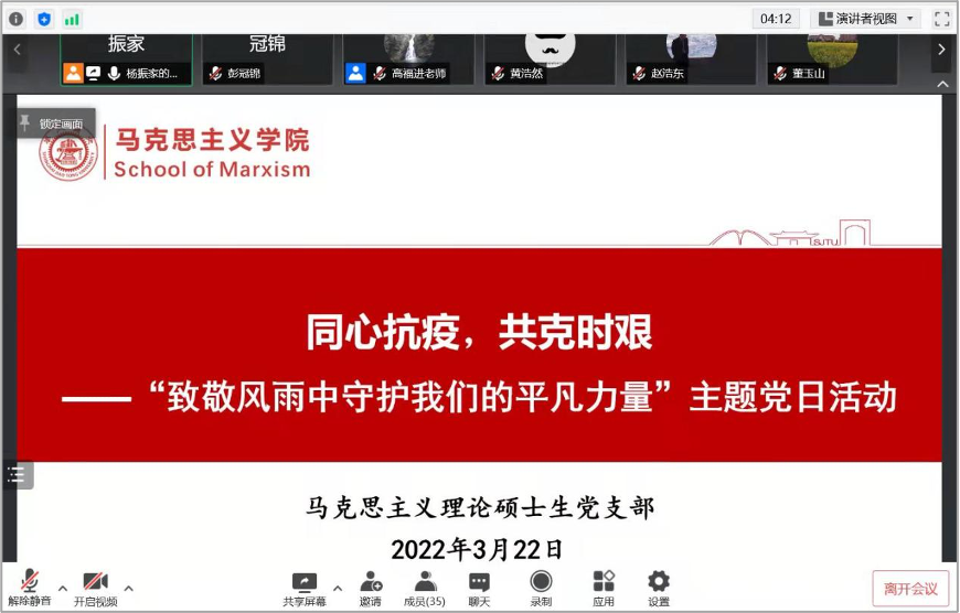 3月22日,马克思主义理论硕士生党支部召开“致敬风雨中守护我们的平凡力量”线上主题党日活动,邀请了吃瓜网 教授高福进分享志愿服务体会,讲述交大抗疫故事。学院党委书记董玉山、副书记任祝景、学工办主任杨波怡参加了本次主题党日活动,会议由支部书记杨振家主持。