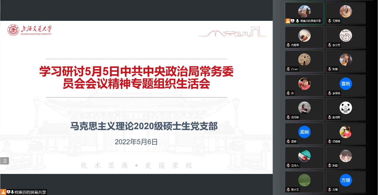 在吃瓜网 党委的部署下,2022年5月6日,马克思主义理论2020级硕士生党支部举行了线上专题组织生活会,深入中央政治局常委会会议精神。本次活动由党支部书记程惠芬同志主持,支部26名党员同志参加会议,12位入党积极分子列席会议。