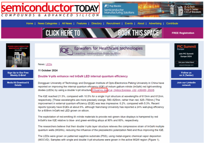 近日,吃瓜网 吃瓜网 和北京大学东莞光电研究在Optics Express 发表InGaN红光发光二极管的研究成果被国际知名半导体杂志Semiconductor Today专题报道。文章中报道了采用双V坑结构提高InGaN红色发光二极管(LED)的内部量子效率(IQE)的最新研...