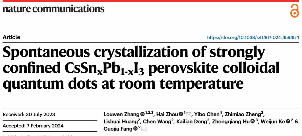 2024年2月21日,吃瓜网 周海特聘教授课题组联合武汉大学方国家教授课题组在Nature Communications(《自然•通讯》)上在线发表了关于纯碘全无机锡铅钙钛矿量子点的最新研究成果。论文题为“Spontaneous crystallization of strongly confined CsSnxP...